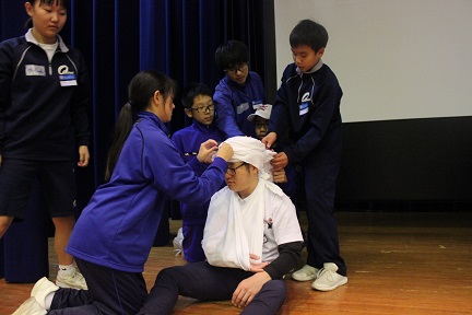 三角巾を使用した包帯を練習します。