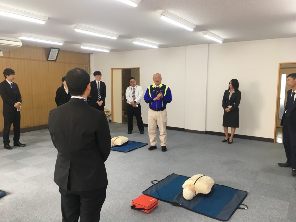 認定セレモニー後は、赤十字救急法講習を実施しバス運転手や職員の方々が受講。バス車内や職場内においての、急な事故や病気に備えてのAEDを使った一時救命処置の方法をお伝えしました。