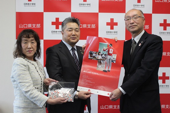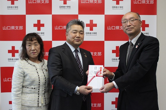 令和2年2月26日、赤十字サポーターの株式会社エイム(宇部市)から、藤井政夫代表取締役と藤井惠子取締役が来られ、当支部が行う防災・減災事業への特別支援として、100万円のご寄付をいただきました。