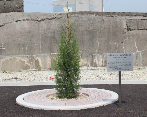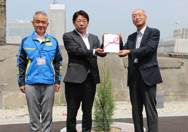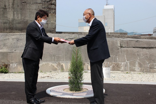 昨年10月に、澤田建設の新社屋完成記念として、同会が青少年赤十字(JRC)のシンボルツリーである「イトスギ」を植樹した際に、青少年赤十字をはじめとする赤十字の活動資金への協力を申し出ていただいており、このたび、その「イトスギ」の前で、澤鵬会の藤井弘会長から支部の藤井事務局長へ目録が手渡されました。