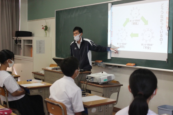 上宇部中学校で「新型コロナウイルス3つの顔を知ろう!」を使った授業が行われました