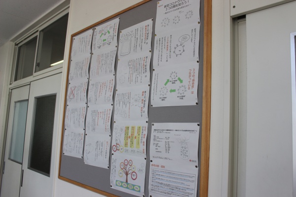 上宇部中学校様では、保健室前の掲示板にこの教材を掲示され、日頃から新型コロウイルスに関する啓発を行っていました。