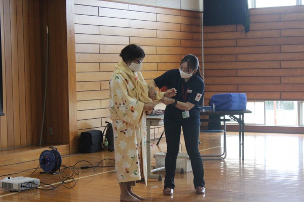 後半は、避難時に役立つ情報として、毛布ガウンや風呂敷を使ったリュックサックの作り方、また避難所で体を拭く際に貴重な水を無駄なく使う方法など、デモンストレーションを行いました。