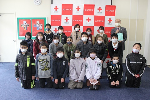 令和3年1月8日(金)、大殿小学校(山口市)のJRC(青少年赤十字)委員会のメンバー20名が、2学期の間に校内で集められた1円玉募金、1,519円を届けてくださいました。