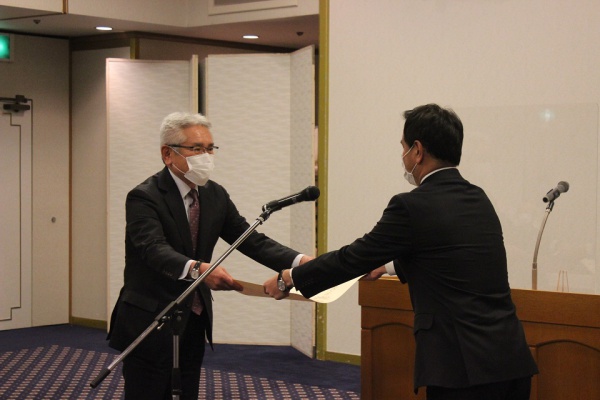 令和3年2月9日(火)、ホテルニュータナカ(山口市)において、令和2年度「日本赤十字社社長感謝状・金色有功章表彰式」を行い、出席いただいた個人1名、企業・団体7社にそれぞれ、村岡嗣政支部長から感謝状や楯などを贈呈しました。