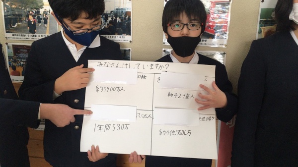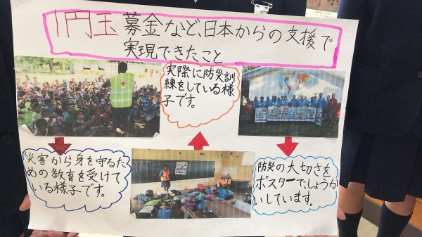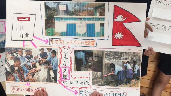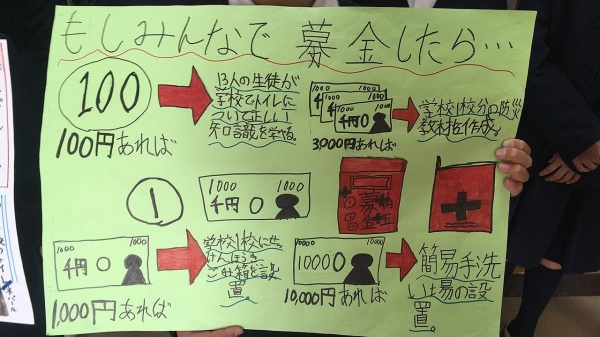 湯田小JRCメンバーは、事前に日赤の「1円玉募金活動」のことを調べ、それを6枚のポスターにまとめました。そして、2月1日~5日の朝、ポスターを持って校内をまわり、理解と協力を求めました。