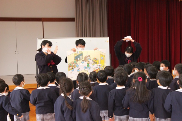 「おさない、はしらない、しゃべらない、もどらない。 『お・は・し・も』を覚えてね!」と身振り手振りを使って、自分の命を守るための行動を伝えました。