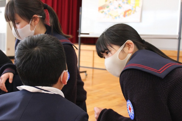 令和3年3月3日(水)、山口県立萩高等学校のJRC部10名が、学校近くの萩幼稚園で年長園児32名を対象に、日赤の幼稚園・保育所向け防災教材「ぼうさいまちがいさがし きけんはっけん!」を使って防災講習を実施しました。