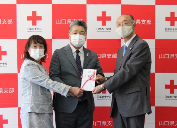 令和3年3月8日(月)、赤十字サポーターである株式会社エイム(宇部市)の、藤井 政夫(ふじい まさお)代表取締役と藤井 惠子(ふじい けいこ)取締役から、東日本大震災から10年という節目に当支部が行う防災・減災事業等への特別支援として、100万円のご寄付をいただきました。