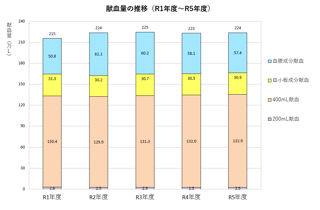 直近の過去5年間における献血量の推移グラフを掲載しています。
