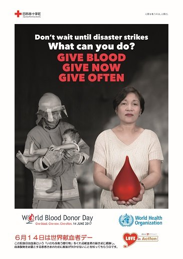 今年の「世界献血者デー」のテーマは、"Give blood. Give now. Give often.(今そしてこれから先も、愛の献血を)"です。これは献血をすることによって誰もが、緊急時に人を救う存在になれることを表現しています。