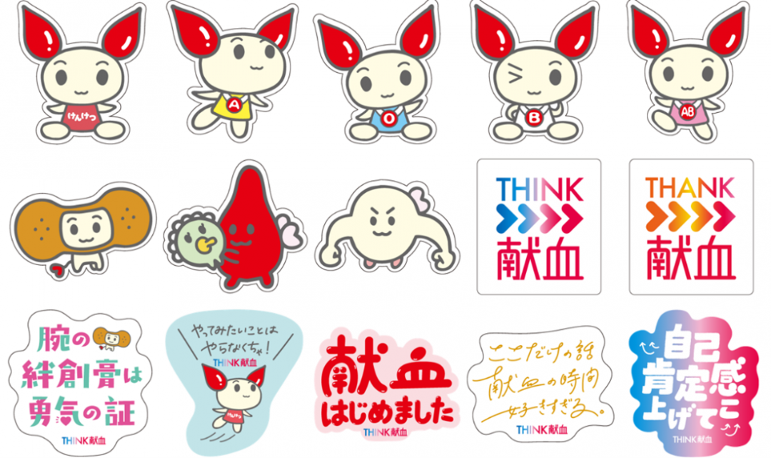 今回配布するステッカーは、献血をより身近に感じていただくことを目指した15種類のデザインを用意しています。献血推進キャラクターの「けんけつちゃん」をはじめ、「THINK献血」ロゴや、献血協力への感謝の気持ちを込めた「THANK献血」ロゴ、その他献血への親近感が湧いてくるメッセージの書かれたステッカーなど、多彩なデザインです。