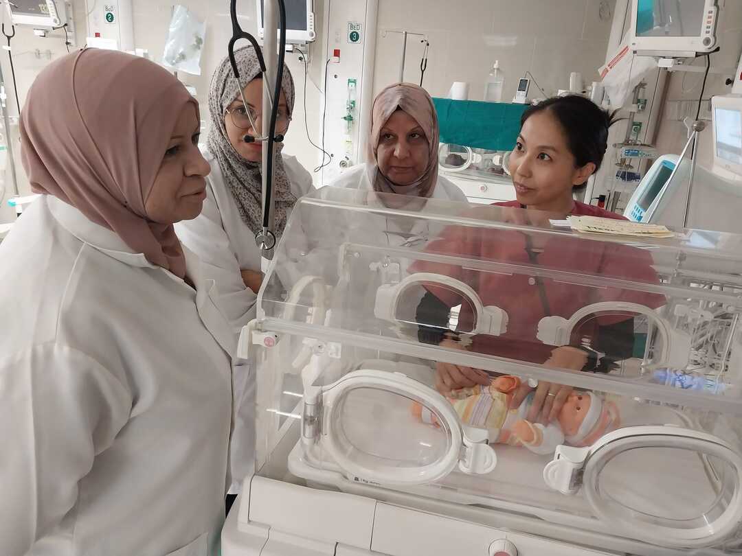 The Medical Cooperation Projects with the PRCS aims to improve the quality of medical services at the hospitals operated by the PRCS in Lebanon and Gaza. Since health workers, who are themselves Palestinian refugees, have limited access to learn additional medical expertise, the JRCS dispatches Japanese doctors and nurses to share their skills. In 2023, the JRCS sent three doctors, five nurses, and three project officers and one regional representative to Lebanon, as well as, dispatched two doctors, one nurse, and one midwife to Gaza. In Lebanon, they worked with local doctors and nurses to take care of patients in emergency departments and hospital wards, to improve echo diagnostic capabilities, and to establish a system for accepting mass casualties. In Gaza, the JRCS provided online support during the COVID-19 pandemic and resumed deployment of JRCS staff to improve nursing practice and strengthen newborn care in July 2023. Unfortunately, these medical support projects have been temporarily suspended in both Lebanon and Gaza due to increased tensions in the region since October 2023.