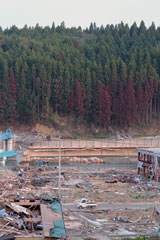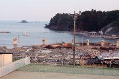 (Photo: Debris lie between the school and the ocean, and one can see it from the balcony of the second story Isatomae Primary School.)
