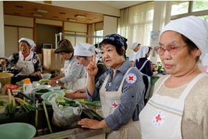 These Japanese Red Cross Society volunteers have had a busy time. For the first month after the disaster, they were cooking and serving three meals a day for the survivors in evacuation centres. Now they’re busy preparing the food for an activity organised for the temporary shelter residents.