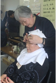 (Photo:Kiyoko Sato, a Japanese Red Cross volunteer gives a facial to an elderly resident of the Tagajo temporary housing centre as part of the Red Cross psychosocial support programme for tsunami survivors.)
