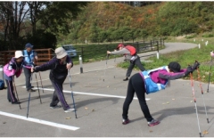 Nordic style walking, a form of exercise which is originally from Finland, is not well known in Japan yet, so for the most of the people it is their first time walking with two poles in the style of cross country skiiers. Compared to normal walking it uses more muscles, eases the pressure on one’s knees, and has a better aerobic effect. “These are magical poles” Takaaki says, “for those elderly who say: ‘I can’t lift my shoulders,’ I make them bend their upper body with their hands on the poles, then you see, it has same effect as putting up the shoulders.”