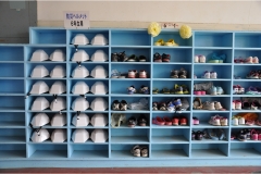 >>Photo:Disaster helmets are placed at the exit of the school building.