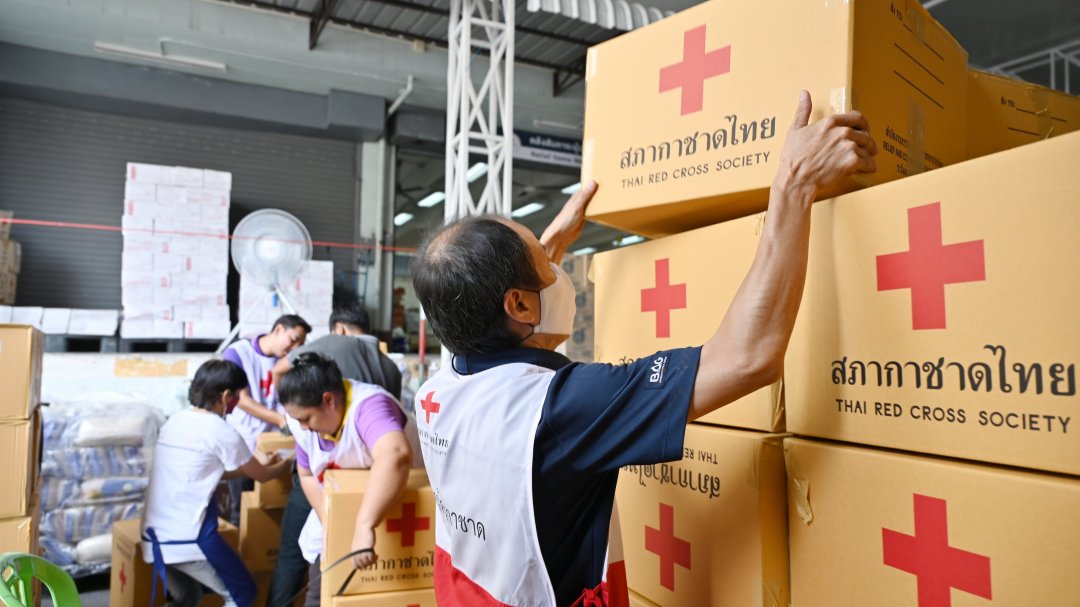 隣国タイでも58人が犠牲となる被害が発生。タイ赤十字社は、ビルの倒壊現場で捜索等に当たるほか、ミャンマーに向けた救援物資の寄贈も行った©TRCS