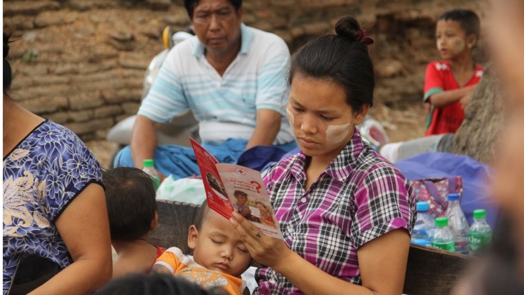 ミャンマー赤十字社から、離れ離れになった家族の再会を支援する活動を紹介するリーフレットを受け取った被災された方©MRCS