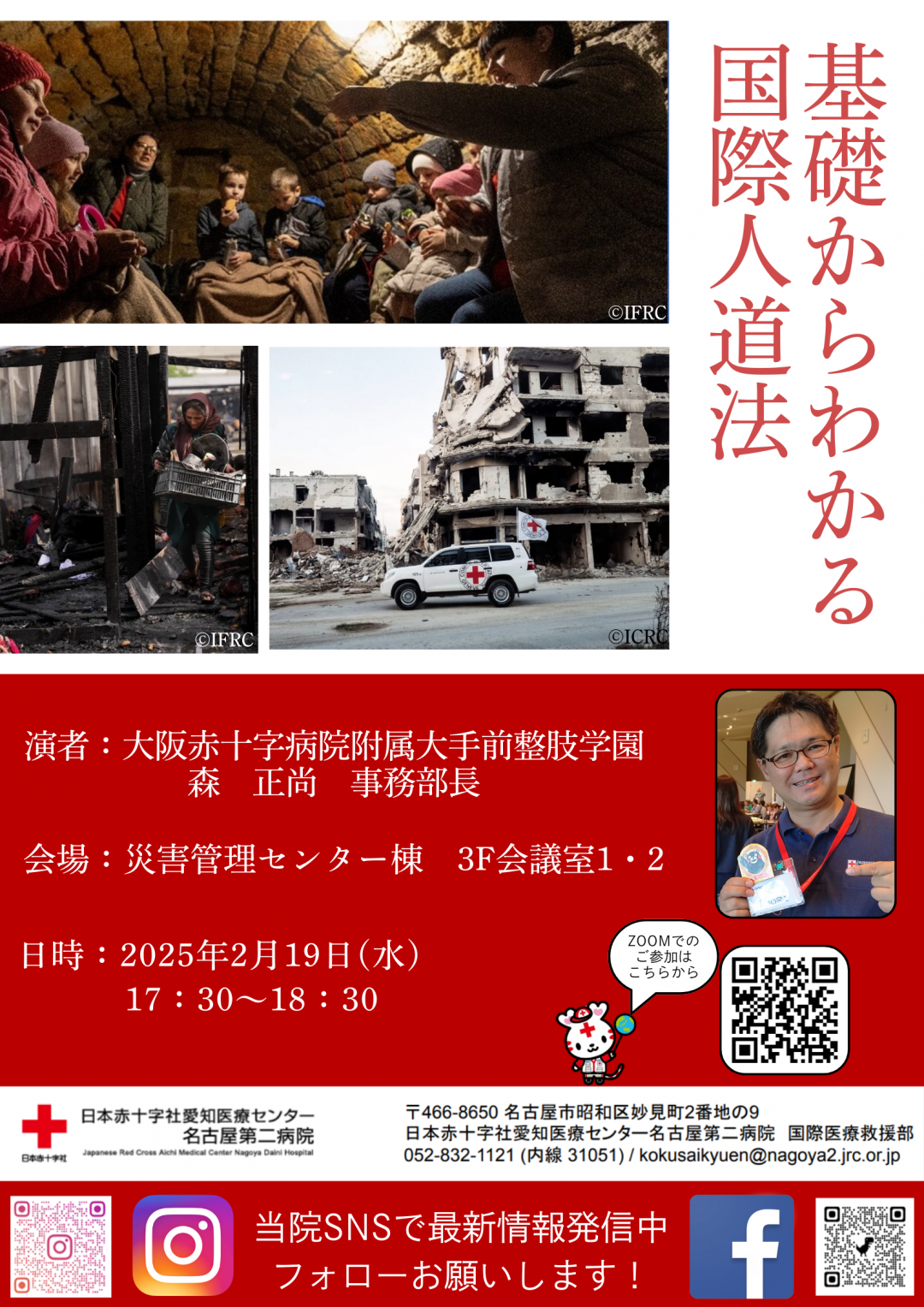 2月の月例研修会では、大阪赤十字病院附属大手前整肢学園の森正尚事務部長より、「基礎からわかる国際人道法」をテーマにお話しいただきます。国際人道法は、武力紛争法の一部で、武力紛争において「やってはいけないこと」を定めています。(出典:赤十字国際委員会(ICRC)、「国際人道法とは」)昨今、ニュースなどで目にする機会が増えていますが、私たちはどれほど理解しているでしょうか。この機会に改めて学び、紛争や人権問題を正しく捉え、生命と尊厳の大切さについて考えてみませんか?どなたでも参加可能ですので、ぜひご応募ください。