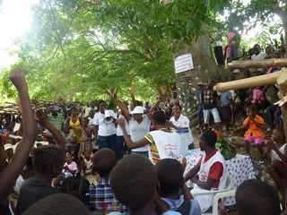 ひょうたんの木の下での啓発イベントに集まる村人たちと盛り上げるコミュニティー・ファシリテーターたち