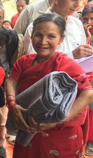 地震発生から1年が経過し、復興に向けて歩みを進めているものの、現地の人びとの暮らしは今なお厳しい状況です。特に、標高の高いネパールの山間部は、冬は厳しい寒さにさらされます。今回配られた毛布は、人びとをあたたかく包むだけでなく、優しいぬくもりも届けたに違いありません。