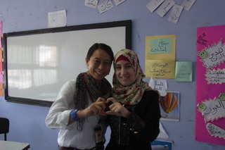 パレスチナ赤ろう学校で、産休中の先生の代わりに臨時教師をしているアスマ・アブダル・カビーン・アニャウィさん(27歳)は、パレスチナ赤ろう学校の卒業生です。アスマさんの家族11人のうち6人(お父さん、9人兄弟のうちの5人)は耳が聞こえません。耳の不自由な兄弟姉妹全員が、パレスチナ赤ろう学校に通いました。アスマさんと兄弟姉妹は、2001年から2年間、パレスチナ・イスラエル紛争の影響を受け、学校に通えず、自宅で勉強をしました。時々、先生が自宅を訪問してくれることもありましたが、兄弟姉妹とともに、非常に辛い2年間の経験だったと語ります。ろう学校を卒業後、大学に入学し、数学を専攻しましたが、通訳のサポートをうけられませんでした。そのため同級生のサポートをうけ、人一倍の努力をしましたが、やはり授業についていくのが難しく、専攻を数学から歴史に変更しました。2年目からは、大学からの通訳サポートがつき、すべての授業を確実に理解できるようになりました。更に、持ち前の努力により、無事に大学を卒業することができました。アスマさんは、「(大学を)卒業できて、すごく嬉しい。今は、仕事を探していることころです。臨時教師ではありますが、自分が通った学校をサポートできることは、非常に心地良いです。自分の大変だった経験を活かし、同じ問題をかかえる子どもたちへのサポートは、非常にやりやすいし、やりがいがあります」と、校長先生の前なので恥ずかしがりながら話してくれました。校長先生は、「アスマさんは、非常に努力家です。今は、臨時教師ですが、正規職員になるための申請を教育省へおこなっています。彼女は、子供たちの良いモデルとして、この学校に戻ってきてくれて非常に嬉しく、誇りに思っています。他の卒業生たちにも、彼女と同様に学校に戻り、学んだ事を、自信をもって次世代の子どもたちに伝えてくれることを期待しています」とコメントしてくれました