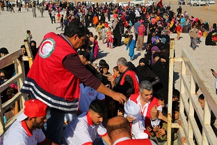 イラク赤新月社のスタッフやボランティアは、避難民キャンプで食料や救援物資の供給に力を入れています。またモスルや周辺地域からキャンプに逃れてきた人々にこころのケアも行っています。イラク北部のキャンプでは、6000世帯、約3万人分の宿舎を用意して戦火を逃れた避難民に提供しています。詳しくはイラク赤新月社のホームページ(英文)をご覧ください。
