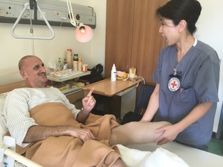「シリアで弁護士をしていた男性患者さんは、内戦後、反体制派から命を狙われたことで、取るものも取りあえず国外へ避難したそうです。家族も呼び寄せる予定でしたが、彼の住んでいた地域は反体制派の統治下となり、家族の国外脱出は困難に。連絡を取ることともできないまま5年が経過してしまったといいます。その間に持病の糖尿病が悪化し、左足を切断、右足もすべての指を失いました。それでも『必ず元気になって仕事に戻り、家族と一緒に生活できると信じている』と気丈に振る舞います。少しでも早くシリアの情勢が落ち着き、みんなが元の生活に戻れることを願いつつ、私にできる唯一のこと、適切でこころのこもった看護を提供するよう心掛けています。」