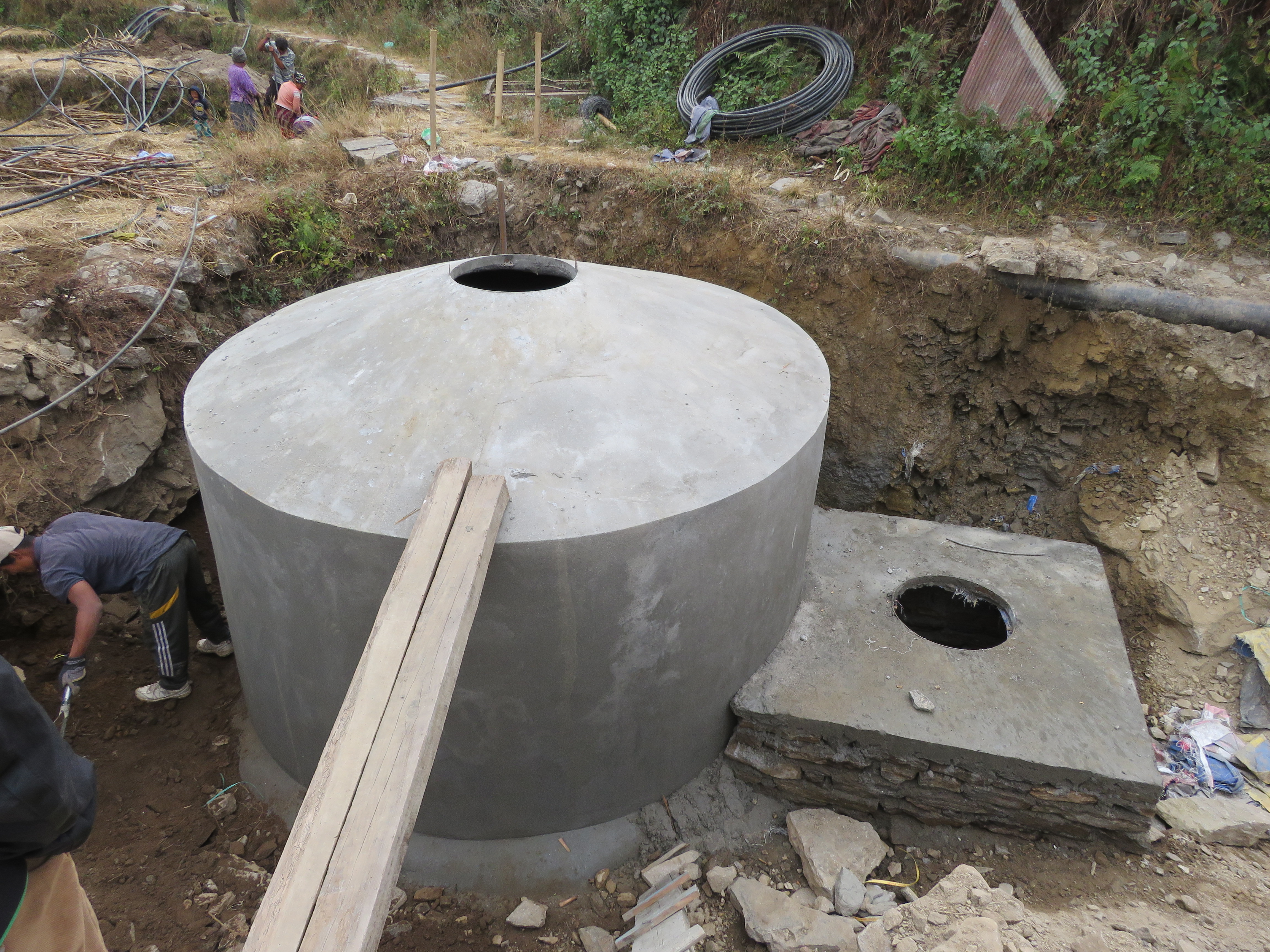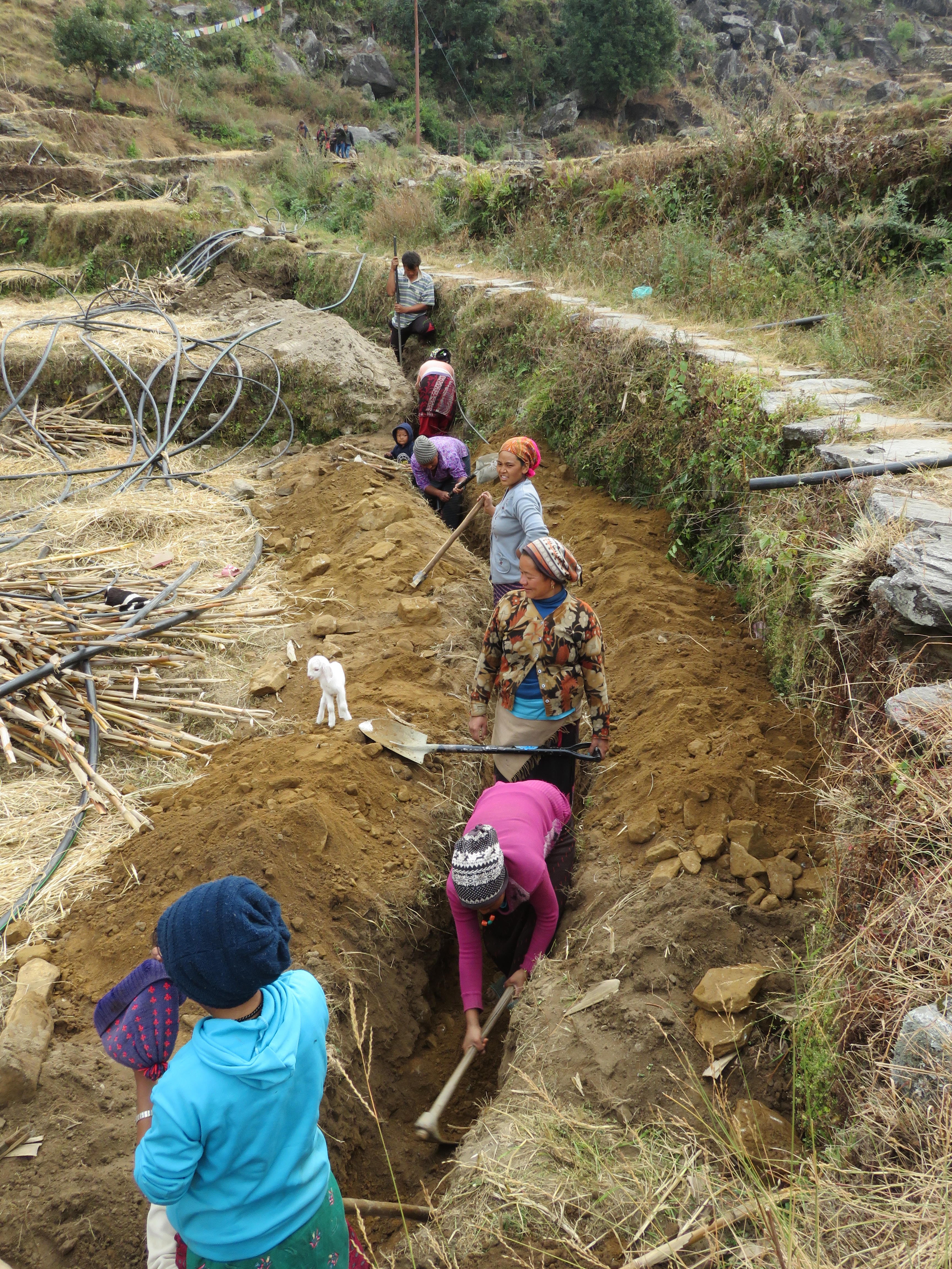 水の供給設備の工事といっても、手掛けるのは行政ではなく、被災地に暮らす住民自身です。日赤は、ネパール赤十字社と協力し、水の安全性の調査、施設の設計、補修資材の提供のほか、工事に参加する住民たちに定期的な技術指導を行っています。住民たちは、そういった赤十字社の支援をもとに、自分たちの生活に必要な水道設備を自らの手で少しずつ造りあげます。水源から流れる水を貯めるためのタンク、共同で使う水道の蛇口、タンクとこの水道施設をつなぐパイプの施工・・・。それぞれの家庭の近くまで水を届けるためには、住民たちの協力が不可欠です。