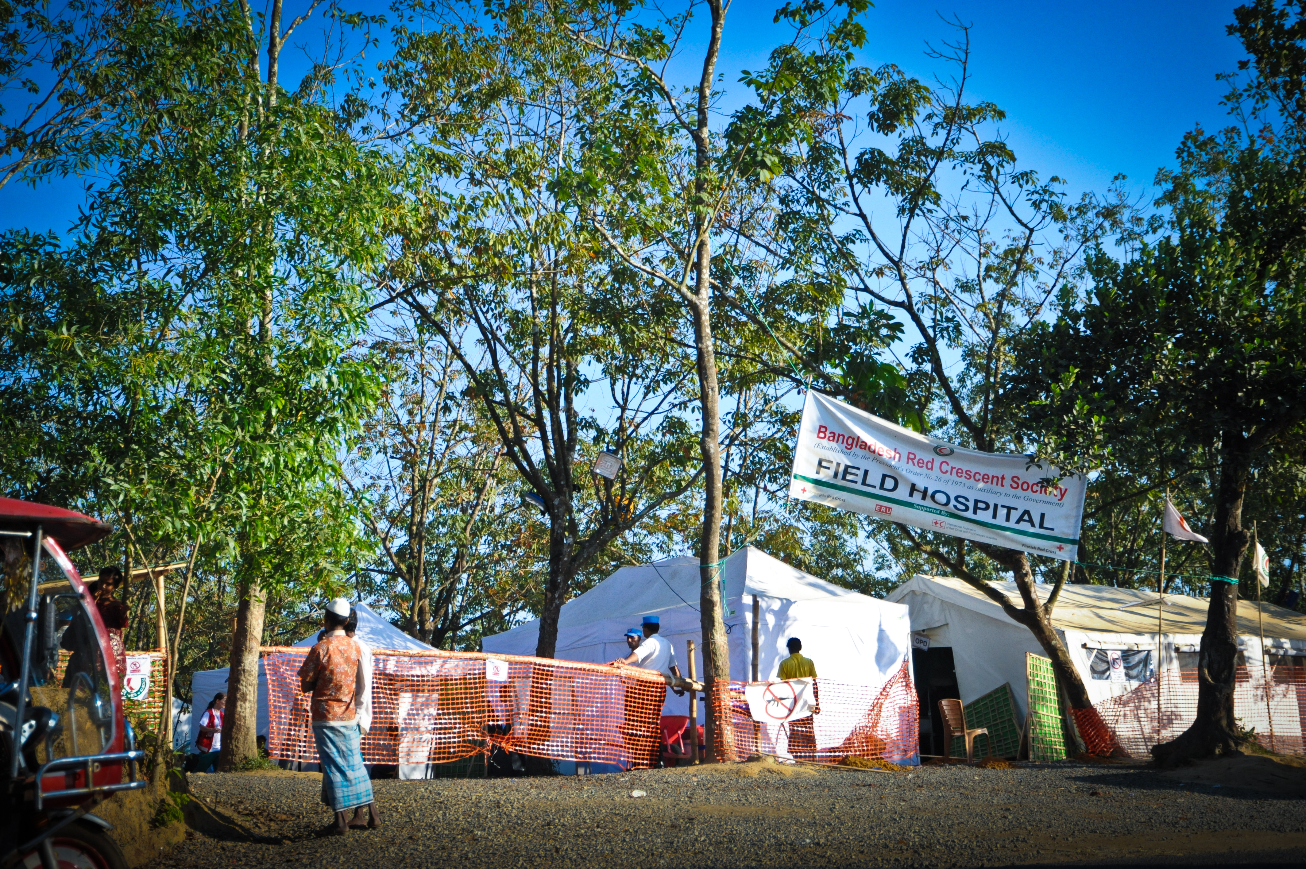 私たちが拠点としているコックスバザールの町から車で約1時間半、南下すると右手に見えてくるのが避難民キャンプです。そして道路を挟んで左手にあるのが昨年10月にノルウェーとフィンランド赤十字社が設置したフィールド・ホスピタル。昨年8月末以降、67万人もの人々が安全を求め、バングラデシュに避難してきています。従来この地域で「病院」と呼べるところはたったの一つだけでした。急激に増加した人口に対してこの病院一つだけでは対応しきれません。そこで手を挙げたのが赤十字でした。