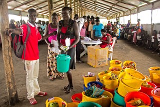 南スーダンでは情勢が悪化し、その難民数は平成30年5月31日現在で、250万人以上に上っています。難民キャンプでは人口が過密化し、衛生環境が悪化しており、母性保護の観点から、衛生用品が大変重宝されています。日赤は、ウガンダにある最大規模の難民キャンプであるビディビディ難民キャンプの女性に、生理用品一式を配付しています。