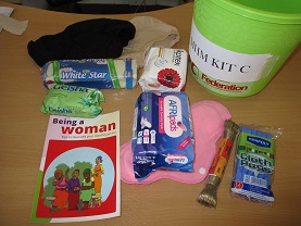 一式の中には、以下のものが含まれます: 生理用品使用方法と月経についての説明書、石鹸、洗濯用洗剤、生理用下着、使い捨て生理用品、布製生理用品、洗濯用紐、洗濯バサミ