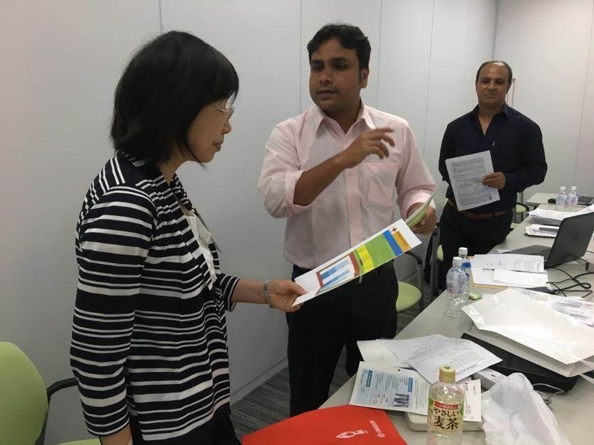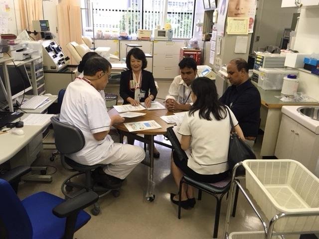 ヘモビジランス・システムを構築するには、その意義や目的を病院に理解してもらい、協力を得ることが重要です。そのため、日赤では医薬情報担当者(Medical Representative:以下、MRという)が血液センターと病院をつなぐ架け橋となり、血液センターの代表として病院を訪問し、医師や看護師などを中心に、輸血用血液製剤の品質・有効性・安全性等に関する情報の収集及び提供に努めています。 ネパール赤十字社においても、このような人材が必要となります。そのため日赤は、ネパール赤十字社血液センターの検査部門よりパワン・グプタさんとラジェンドゥラ・ラヤさんの2名を招聘し、7月31日~8月10日の2週間、MR研修を実施しました。この研修では、MRや血液事業の担当者がマンツーマンで講義を行うだけでなく、MRが実際に病院を訪問する場に同行し、医療関係者と情報を交換する様子を実際に見て学ぶことで、理解を深めてもらいました。また、帰国後すぐにMR活動をはじめられるように、病院で配付するパンフレットの作成や、医師や看護師に輸血用血液製剤の適切な取り扱い方を説明するためのロールプレイングを実施するなど、実践的な研修を行いました。