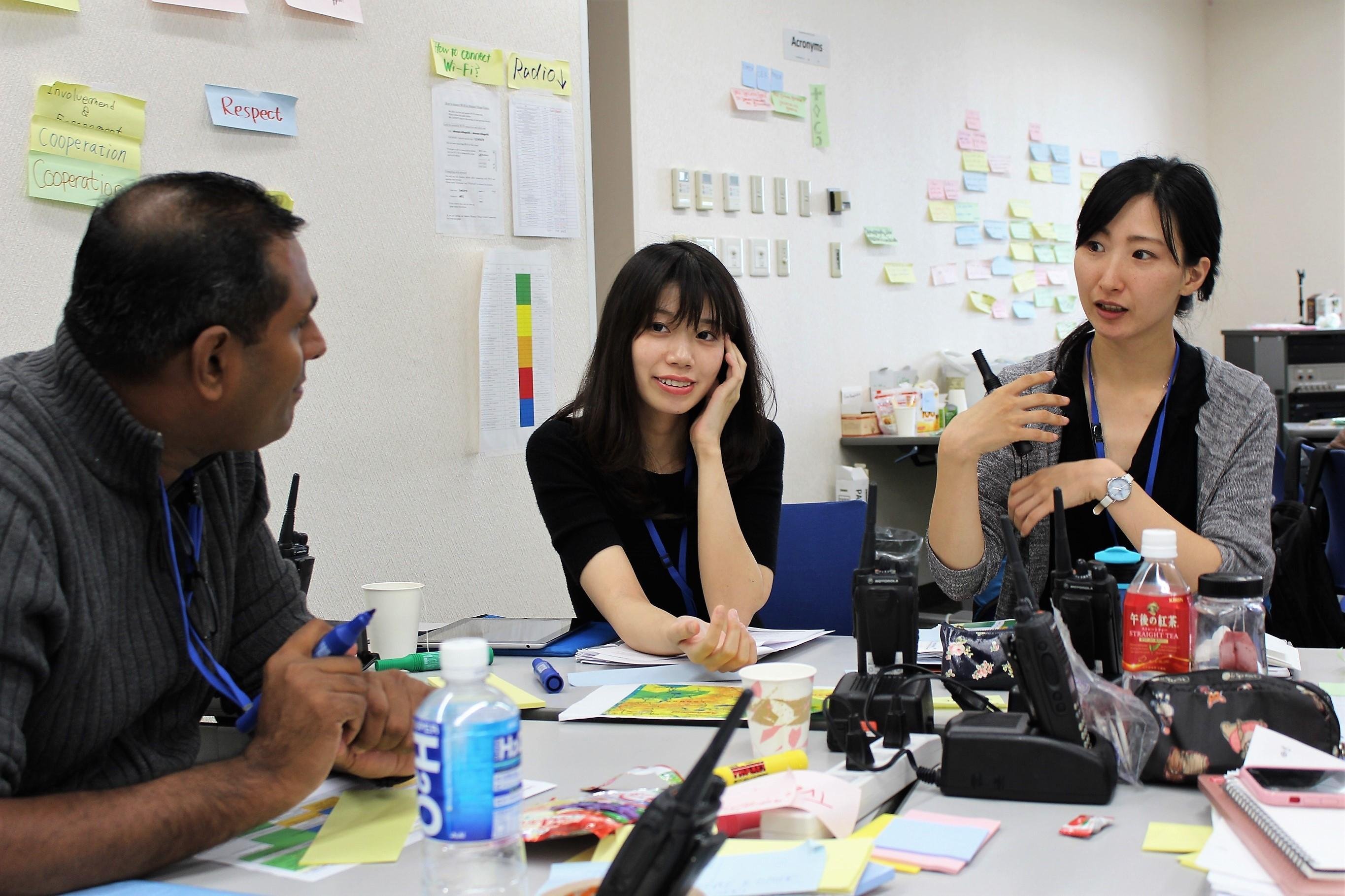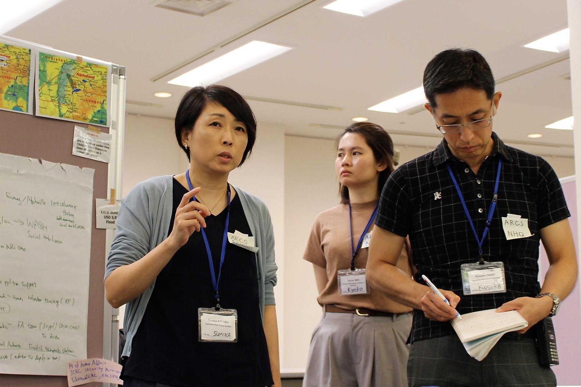 研修後半では、架空の国で発生した災害と紛争のシナリオが与えられ、参加者は講義やグループワークで習得したばかりの知識をフル活用しながら、めまぐるしく変わる状況にチームで対応していきました。