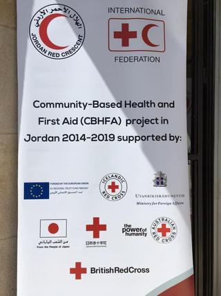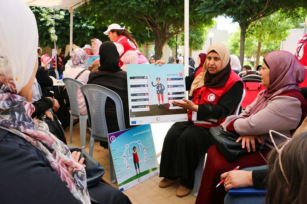 ヨルダン赤新月社(以下、「ヨルダン赤」)は、国際赤十字・赤新月社連盟(以下、「連盟」)の支援を受け、2014年から地域住民参加型保健(Community-Based Health and First Aid: CBHFA)事業を展開しています。CBHFAとは、対象地域でボランティアを育成し、家庭訪問や健康キャンペーンを通して、住民に健康情報や疾病予防についての知識の普及を行う活動です。シリア危機以降急増したシリア難民と、シリア難民を受け入れることで影響を受けているヨルダンの地元住民を対象に、地域の健康増進を目的として行われています。