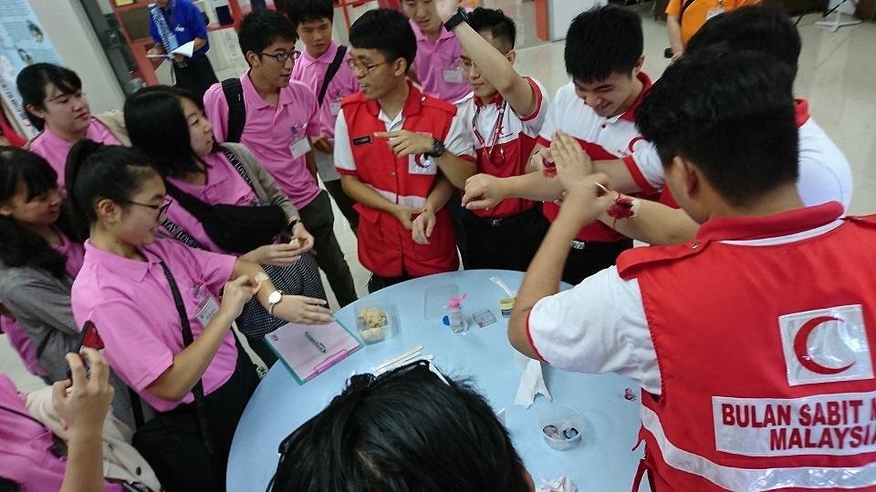 マレーシア赤新月社では、「キズメイク」の体験をさせていただきました。災害対応の訓練では、職員やボランティアが本番の血や傷に驚かないように、まるで本物のようなメイクをして、シミュレーションするのだそうです。マレーシアのユースボランティアの方がとても優しく接してくれて、メイクの方法を伝授してくれました。