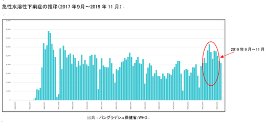 現地の保健省からは、これまで"コレラアウトブレイク"の宣言は出されていませんが、バングラデシュ保健省/WHOの最新週報(11月11~17日)によると、
