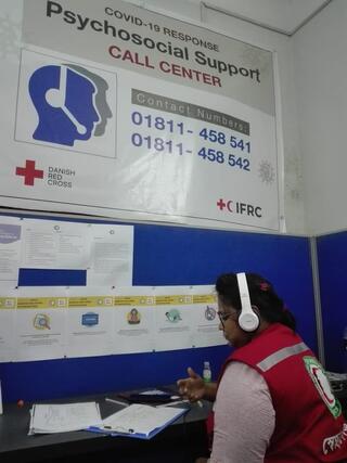 バングラデシュ赤新月社は、6名のボランティアと専門知識を持つ2名の医師でこのホットラインに対応。並行して研修を実施し、対応できるボランティアの数を増やしています。