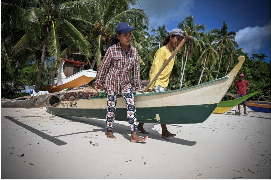 (写真:手漕ぎの小さなボートで海藻を育てる沖合いの養殖場へ向かう © Alecs Ongcal/IFRC)