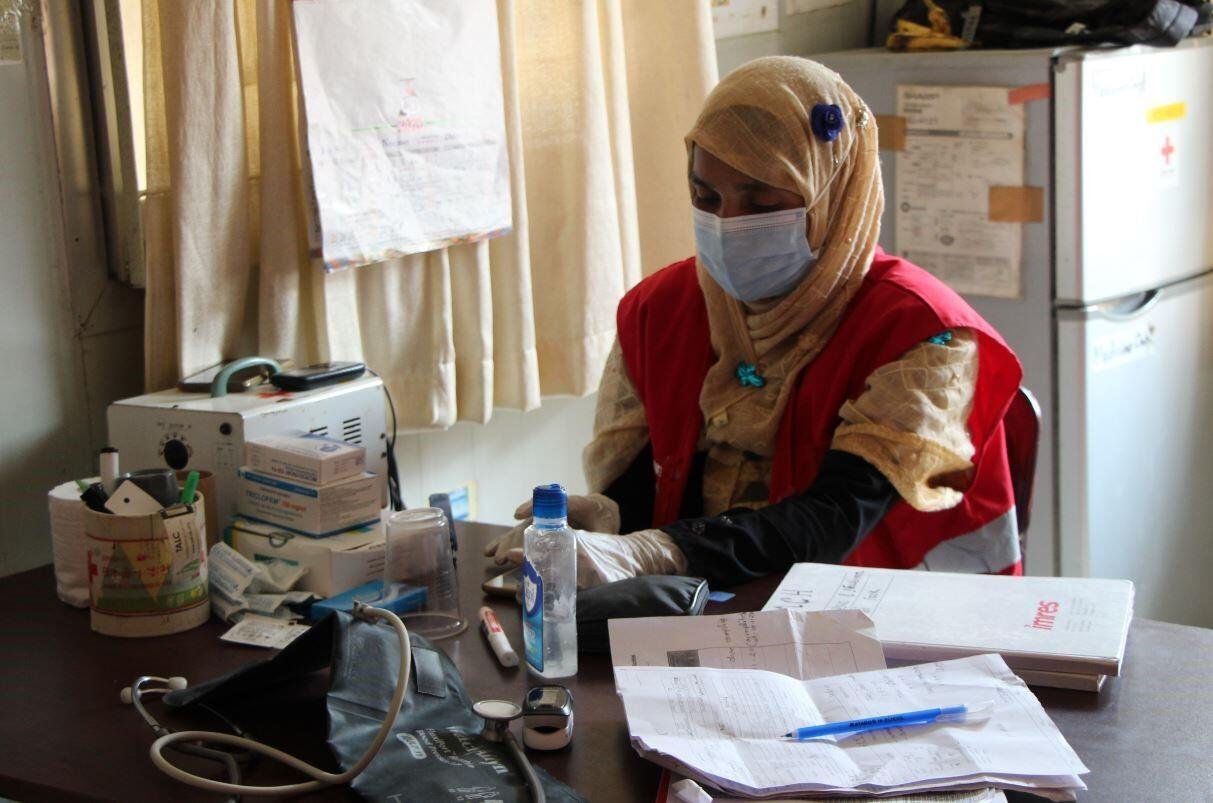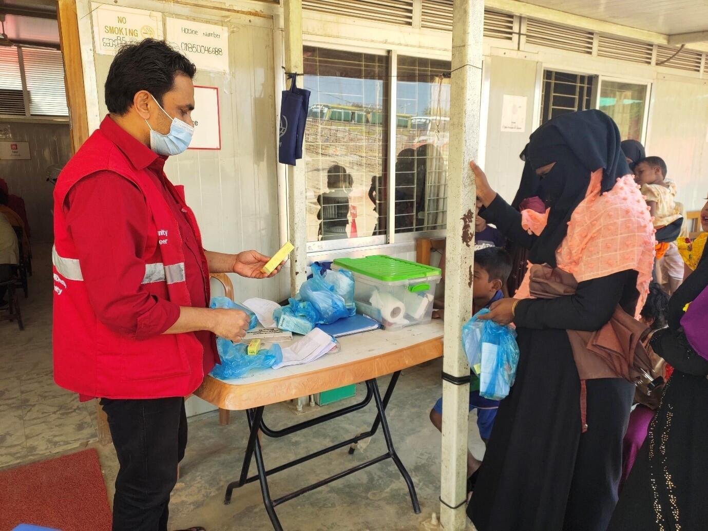 新型コロナウイルス感染拡大の影響を受け、2020年3月から日本人要員が不在の中、避難民キャンプに住む人びとの健康を支えているのはバングラデシュ赤新月社(以下、バングラ赤)の医療スタッフ14名(医師、看護師、助産師、薬剤師、コミュニティ・モビライザー)と避難民ボランティアたち約70名です。避難民ボランティアたちは、診療所、地域保健、こころのケア(心理社会的支援)の活動でそれぞれ役割を担っていますが、今回は診療所で活動する避難民ボランティアを紹介します。