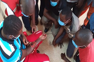 ウガンダ赤は、高まる救急法のニーズに対応するため、救急法の指導員の育成・能力強化にも力を入れています。2020年度は、新たに整備された救急法講習センターにおいて2回の救急法指導者研修が行われ、ウガンダ赤支部の救急法部門に在籍する合計31人が参加しました。参加者たちは、最新の心肺蘇生法や新型コロナ禍でのガイドラインに沿いながら、救急法の知識・技術を再取得し、また指導者としての教え方を磨き直したほか、最新の資機材を用いたシミュレーションを通じて、緊急現場における負傷者への対応能力を強化しました。加えて、救急法指導員たちの“営業力”を高めるための研修も実施されました。2020年度は西部地区およびエンテベ支部から40人が参加し、企業等を対象とした有料の救急法講習を効果的に実施していくための交渉力やビジネススキルを学びました。