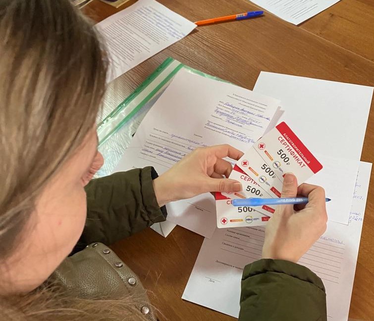 ロシア赤十字社のボランティアは、ロシア南西部のヴォロネジで、ウクライナから避難してきた人々に対して生活物資等が購入できる金券型のバウチャーを配付しました。ほかの地域でも配付をすすめる予定です。