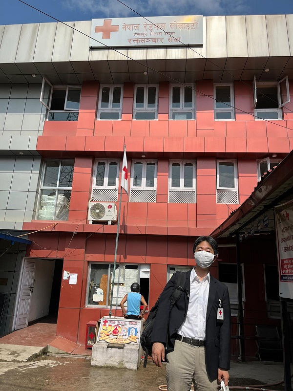 その中の血液センター支援事業で実施した資機材の整備については、新型コロナウイルス感染症の世界的流行による渡航制限等により、設置完了後の日赤による現地視察ができていませんでした。ネパールの新型コロナウイルス感染症まん延状況が一定の落ち着きをみせた2022年7月上旬、辻田国際部開発協力課長が同国を訪問し、血液センター支援事業で支援したバクタプール血液センターに向かいました。