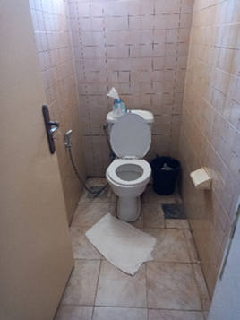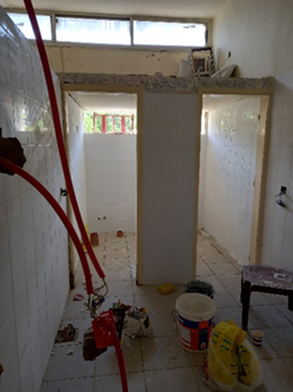 フォー診療所の改修前(左)と改修工事中(右)のトイレ。車椅子でもトイレが利用できるように、ドアやトイレ内を広げる予定です。
