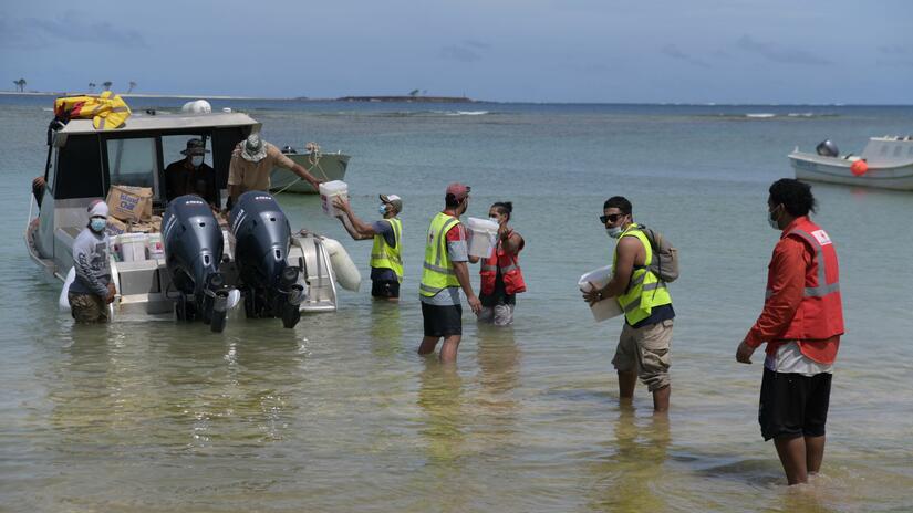 救援物資をボートに積み込むトンガ赤十字社の職員とボランティア(C) Malau Media/IFRC