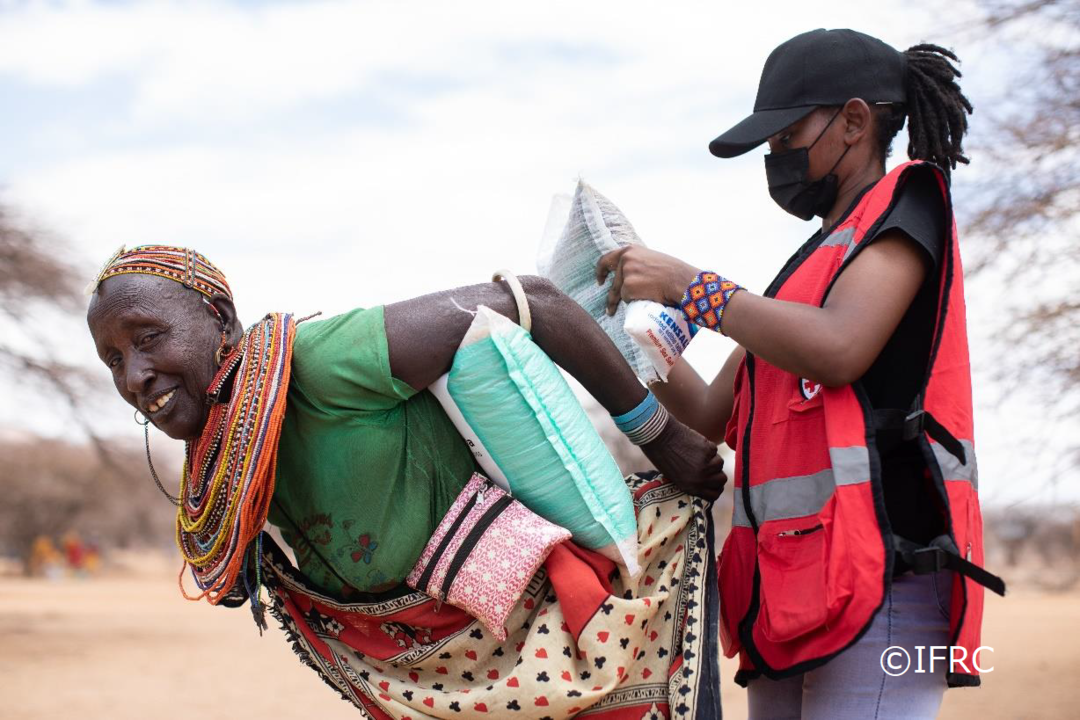 提供された食料を運ぶ女性を手伝うケニア赤十字社ボランティア