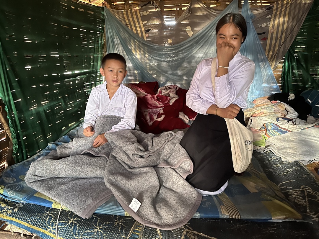 それは、竹と小枝、ビニールシート等を組み合わせて作られた簡素な小屋であり、中には電気も水道もありません。地面は湿っており、隙間風も害虫も入って来ます。こうした厳しい生活環境にありますが、姉弟は助け合って寄宿生活を送り、学校での学びを続けています。今、配られたばかりの2枚の毛布を嬉しそうに見せてくれました。