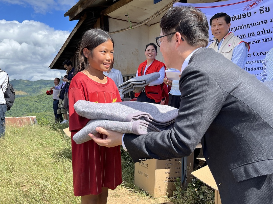 2009年の開始から寄贈した毛布は、合計35,000枚を超えます。日本赤十字社(以下、「日赤」)は、2011年からオンワードとパートナーシップを組んでこの取り組みに協力しており、新型コロナウイルス感染症の影響で4年ぶりの再開となった今年は、ラオス人民民主共和国(以下「ラオス」)の赤十字社を通じて、合計4,000枚の毛布を寄贈しました。